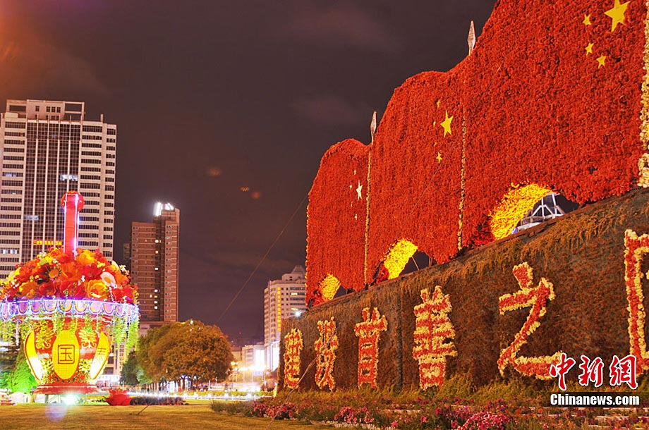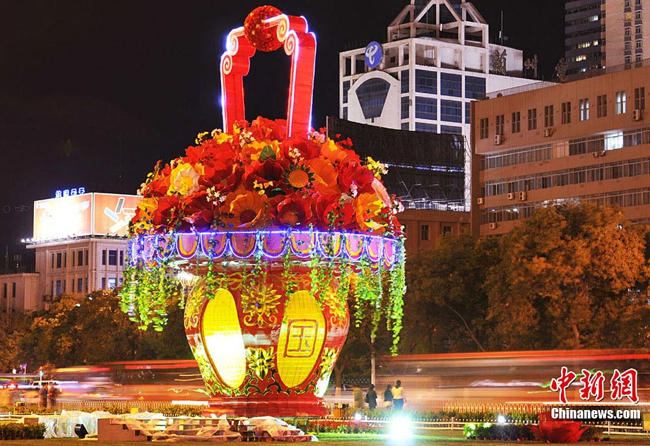 9月20日,中秋、國(guó)慶雙節(jié)即將到來,蘭州東方紅廣場(chǎng)布置一新,花籃上標(biāo)注有“和諧社會(huì)”與“國(guó)泰民安”。 楊艷敏 攝
