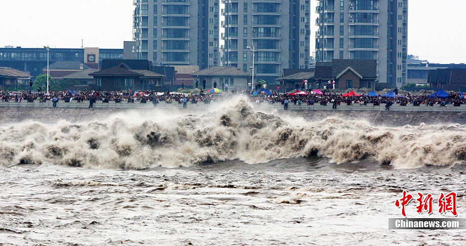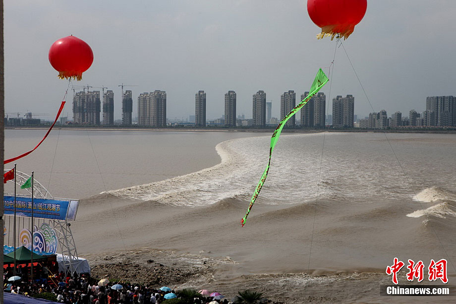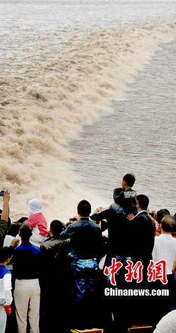 八月十八潮,壯觀天下無。9月25日12時38分,近八年最大錢塘潮如約而至抵達浙江省海寧鹽官,來自世界各地的游客爭睹“一線潮”景觀。汪恩民 攝