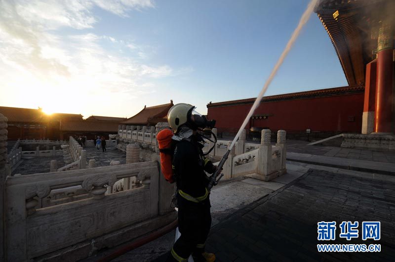 9月27日,北京消防部門在北京故宮太和殿舉行消防演習(xí)。北京消防部門開展多種形式的滅火救援演練,并加大演練的頻次和力度,保障今年“十一”長假期間的消防安全。李文 攝 圖片來源:新華網(wǎng)