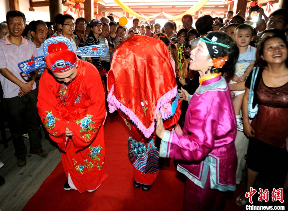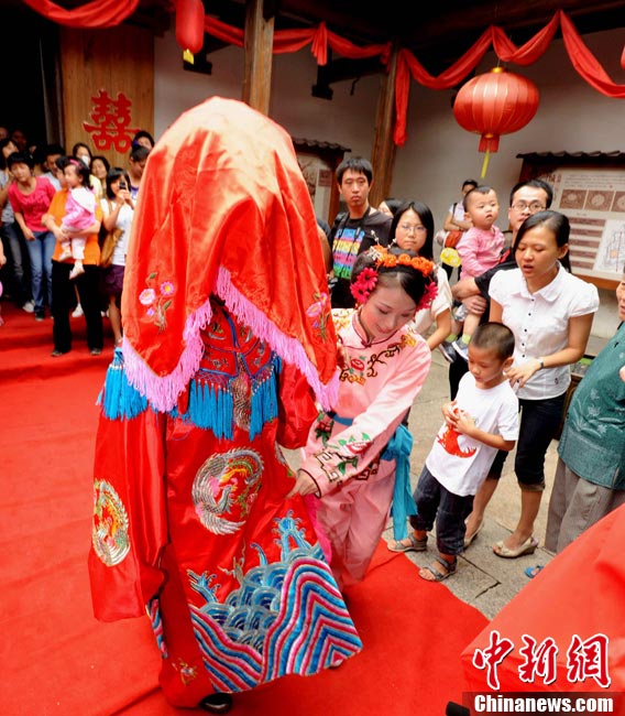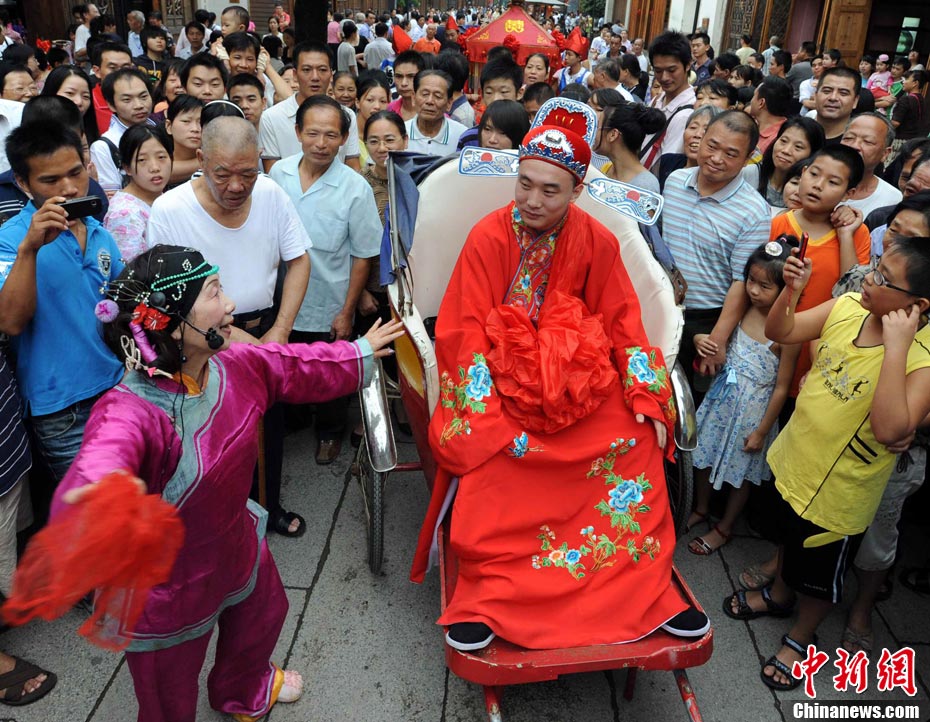 10月1日國慶節(jié),福州古街上演一場傳統(tǒng)民俗婚禮令眾多游客爭睹。該傳統(tǒng)民俗婚禮分起轎、回車馬、迎轎、下轎、祭拜天地、入洞房等場面喜慶。