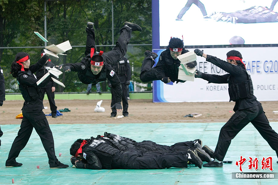 當(dāng)?shù)貢r間10月4日,韓國特警在首爾舉行了反恐演習(xí)。此次演習(xí)是為了即將于11月在韓國舉行的G20首腦峰會而做的準(zhǔn)備工作。