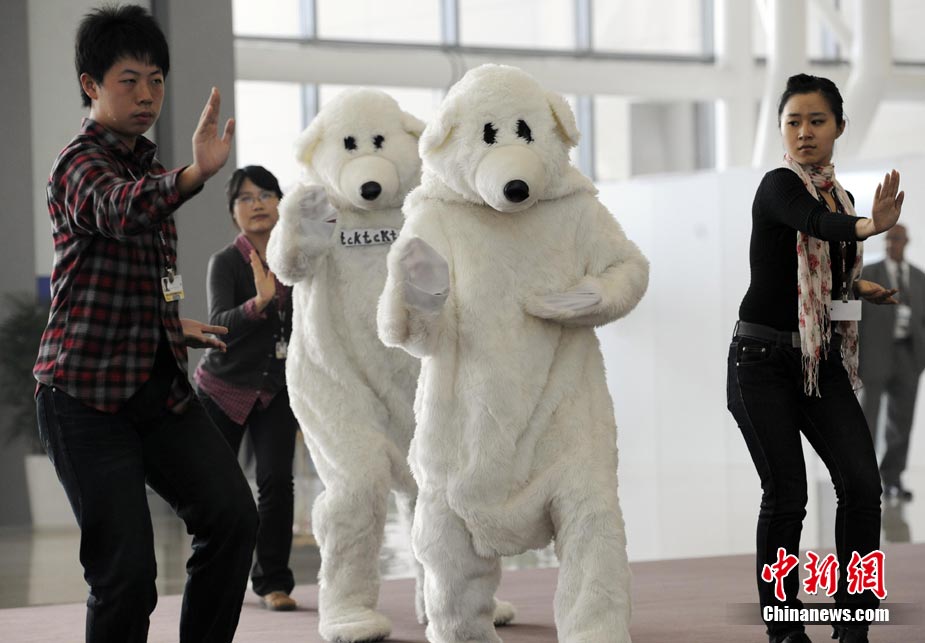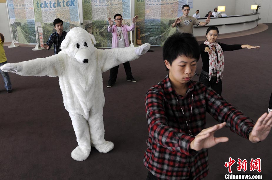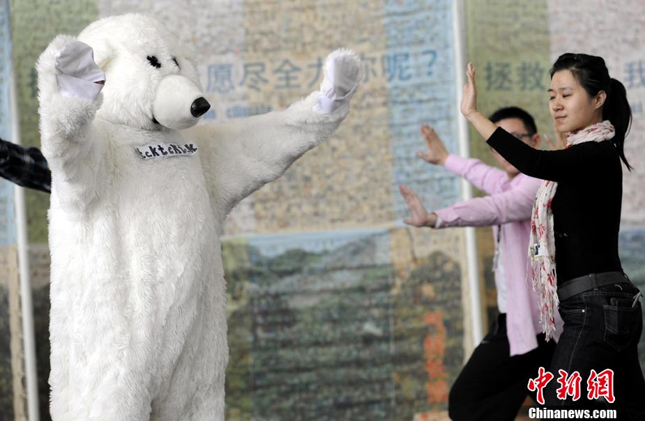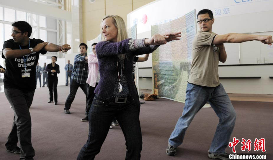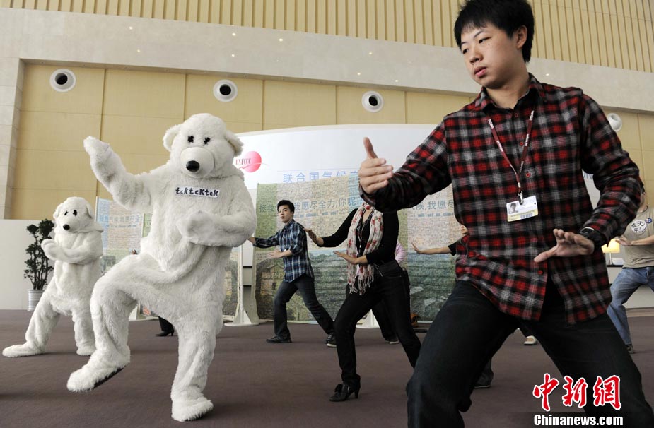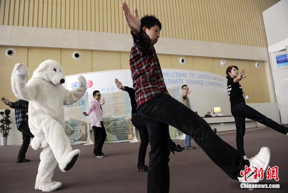 10月6日,聯(lián)合國氣候變化國際談判天津會議繼續(xù)舉行。全球氣候行動聯(lián)盟(TckTckTck 運(yùn)動)特意安排了一個“北極熊”打太極的活動,邀請各國代表進(jìn)入會場之前加入打太極拳。希望這兩天談判各方達(dá)成一個 “balanced package"(顧及各方利益的均衡協(xié)議),并以此警示人們愛護(hù)環(huán)境,拯救地球氣候。該組織由200個來自中國以及世界其他國家民間組織組成。 中新社記者 劉震 攝