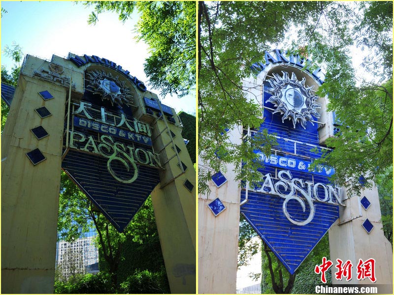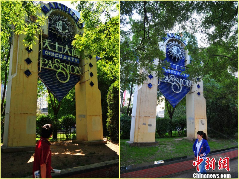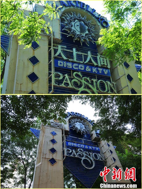 10月5日,北京東三環(huán)北路,蜚聲全國的京城第一夜總會(huì)——“天上人間”夜總會(huì)的招牌已經(jīng)摘下。此前,因涉嫌有償陪侍,“天上人間”夜總會(huì)被勒令停業(yè)整頓。圖為摘牌前后的“天上人間”夜總會(huì)。 圖片來源:CFP視覺中國
