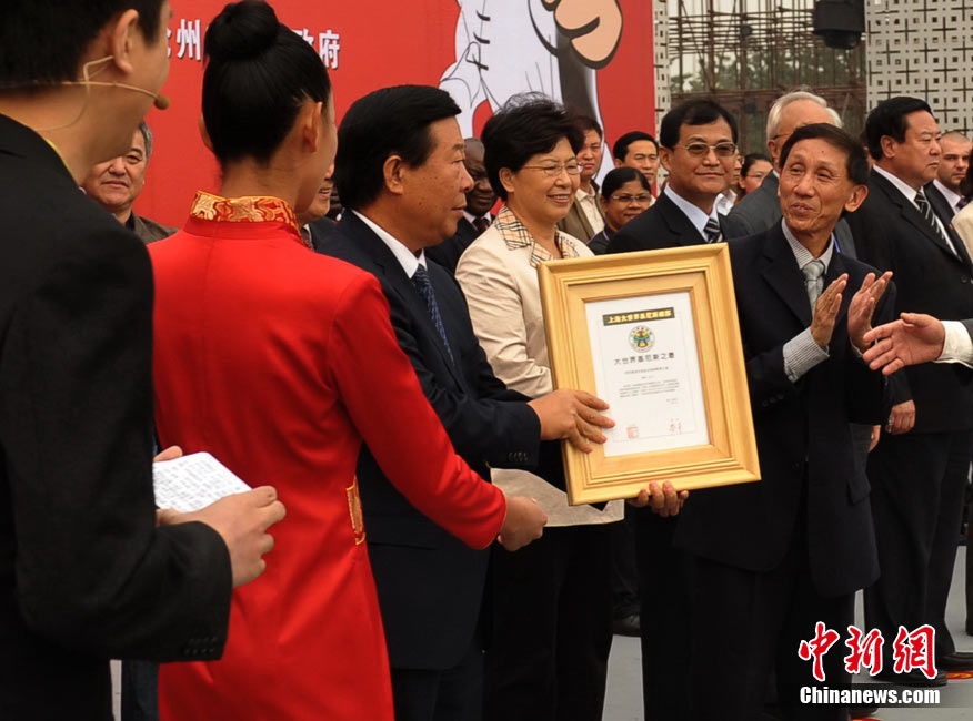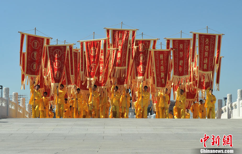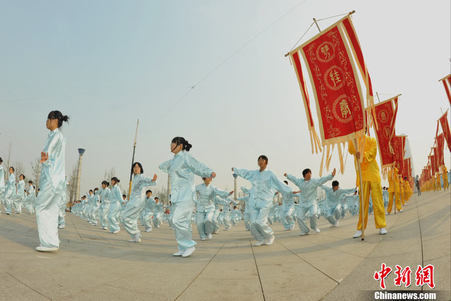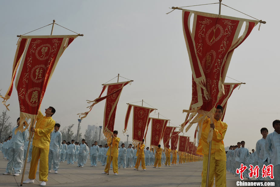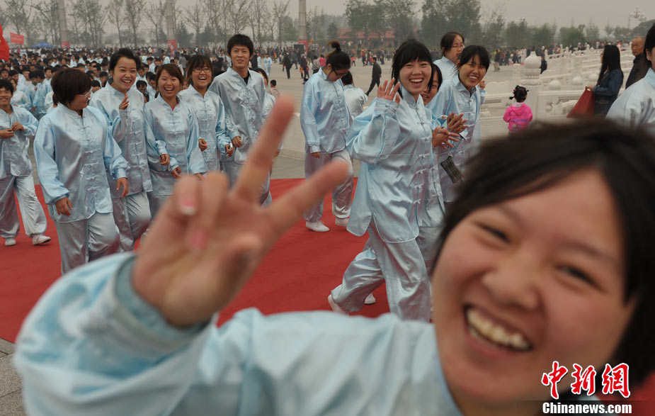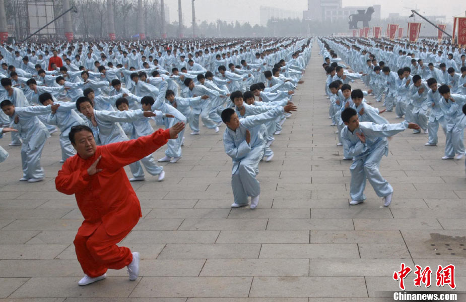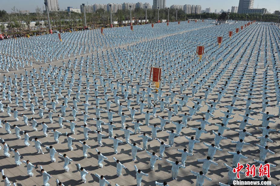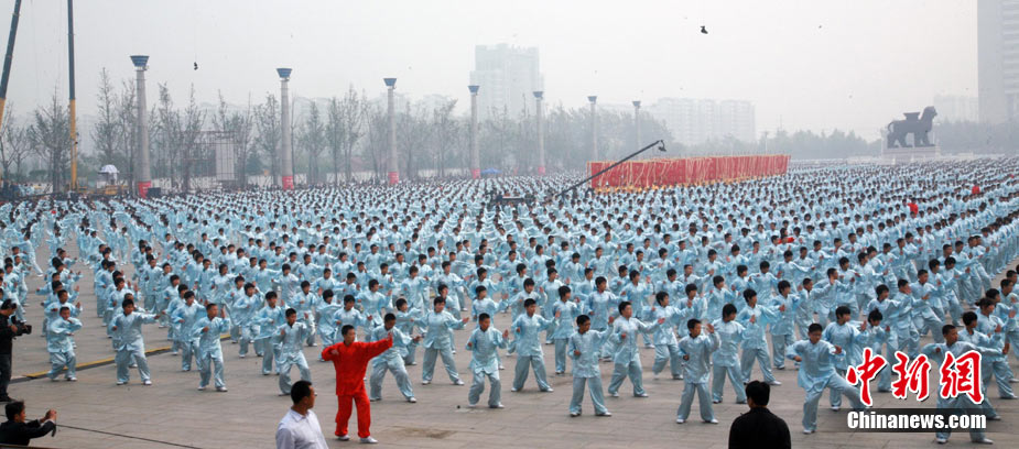 10月10日,中國“武術(shù)之鄉(xiāng)”滄州獅城公園廣場“拳濤”滾滾、武健泱泱,1.5萬人同習(xí)53個(gè)拳種,創(chuàng)造了《中國武術(shù)拳種同時(shí)展演數(shù)量之最》吉尼斯紀(jì)錄,上海大世界吉尼斯總部現(xiàn)場認(rèn)證。圖為萬人習(xí)武現(xiàn)場。王少華 張書儉 攝