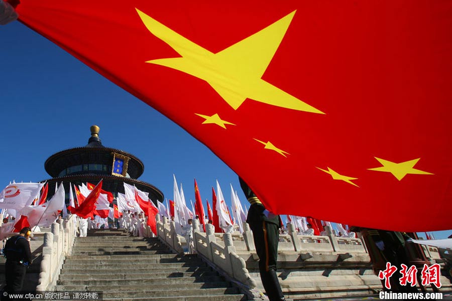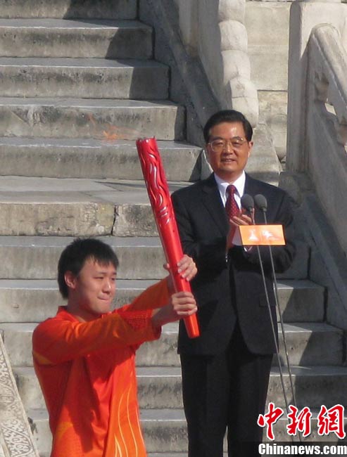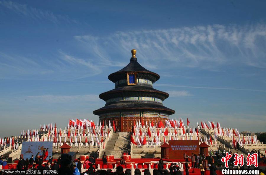 10月12日上午,廣州亞運會火炬點燃暨傳遞啟動儀式在北京天壇祈年殿南廣場舉行。10點17分,中共中央總書記、國家主席胡錦濤點燃主火炬。 中新社記者 沈晨 攝