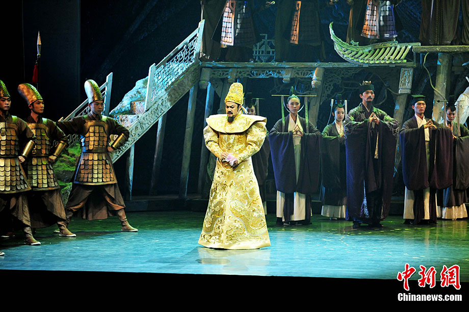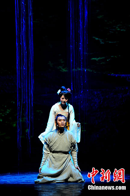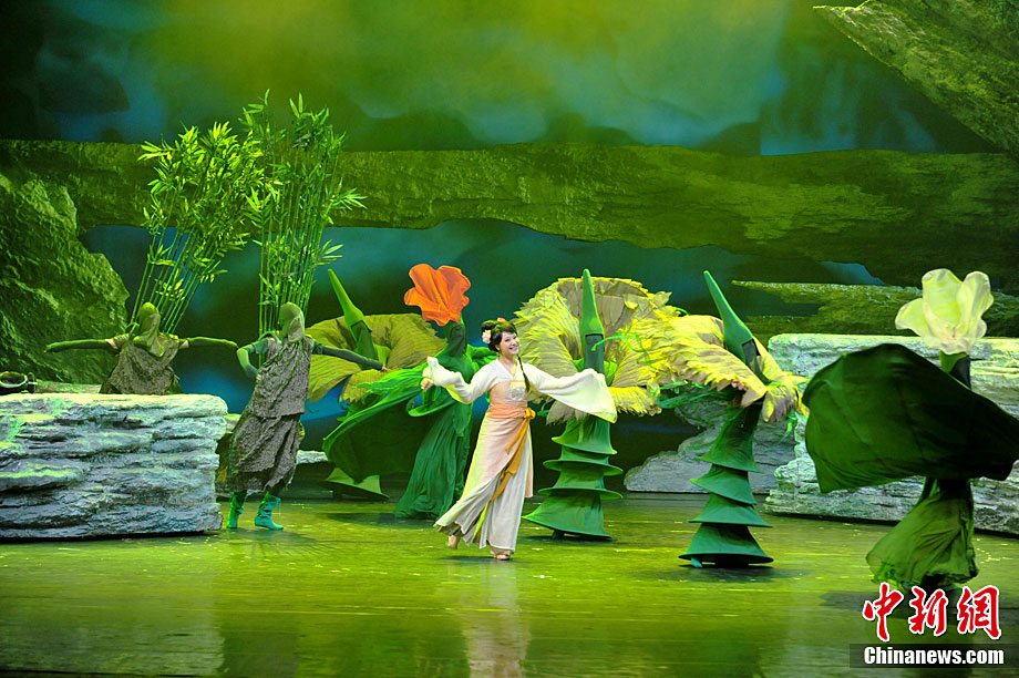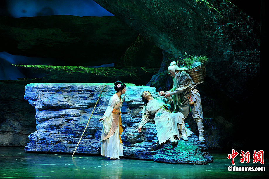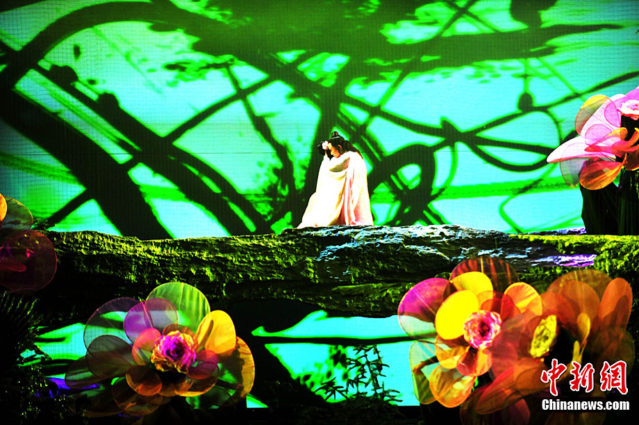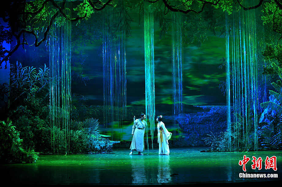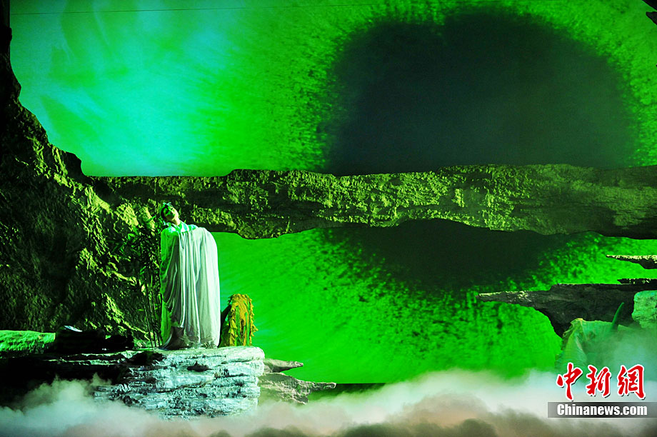 10月16日晚,匯集了中國內(nèi)地頂級(jí)音樂劇創(chuàng)作團(tuán)隊(duì)集體智慧的大型原創(chuàng)多媒體音樂劇《青城》在成都錦城藝術(shù)宮舉行全球首演。該劇以青城山傳統(tǒng)道教文化為精神內(nèi)核,以成都市唯一的世界自然文化雙遺產(chǎn)地“青城山—都江堰”作為劇情發(fā)展“舞臺(tái)”,是全球“首部道文化多媒體音樂劇”,也是象征成都市都江堰災(zāi)后文化重建、人性重建、精神重建的文化作品。圖為《青城》劇照。中新社發(fā) 安源 攝