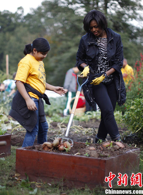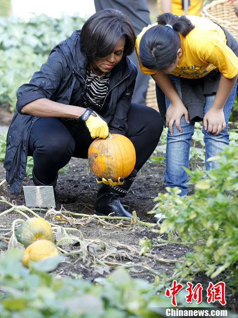 10月20日,美國華盛頓,美國第一夫人米歇爾·奧巴馬與小學生一起收獲白宮菜園里種植的菜蔬。