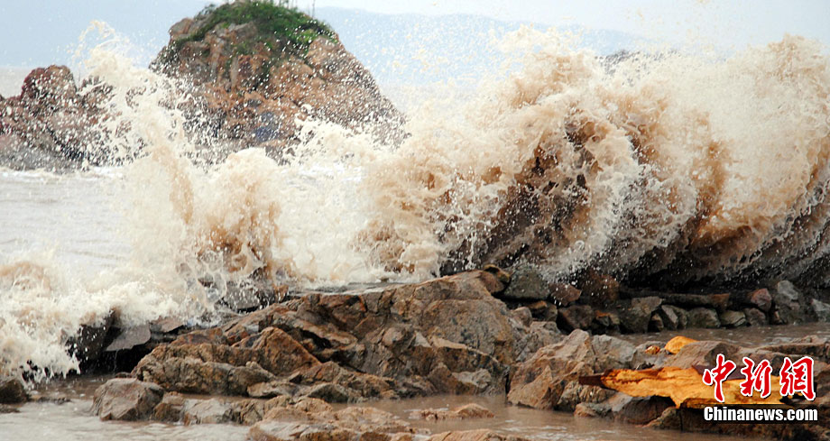 10月21日上午,浙江溫嶺市城南鎮(zhèn)后灣塘堤壩上,正在退去的潮水夾雜著海風拍打岸邊。受今年第13號超強臺風“鲇魚”的影響,當日,浙江溫嶺市沿海海面出現(xiàn)9到11級大風。圖片來源:cnsphoto 金云國 攝
