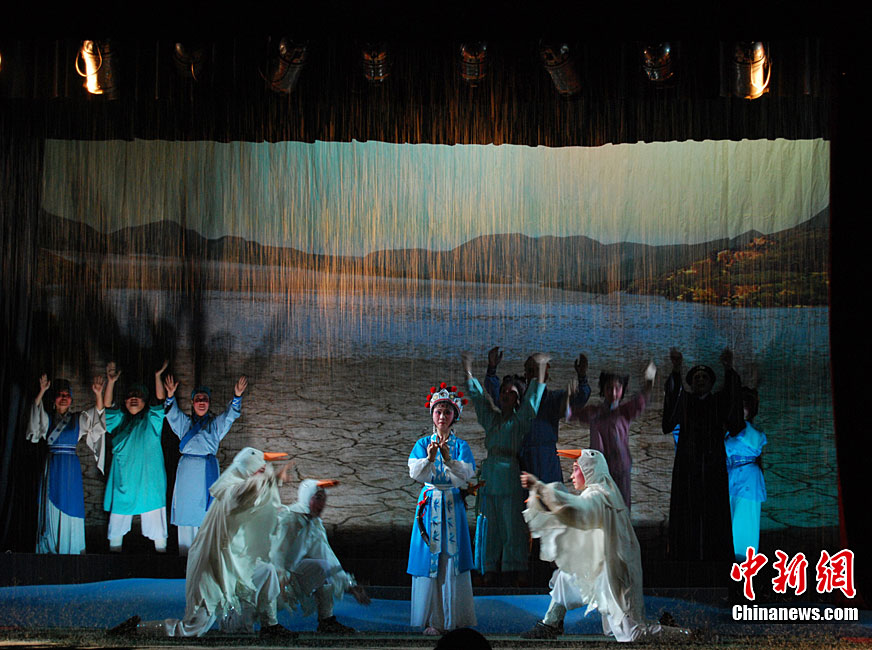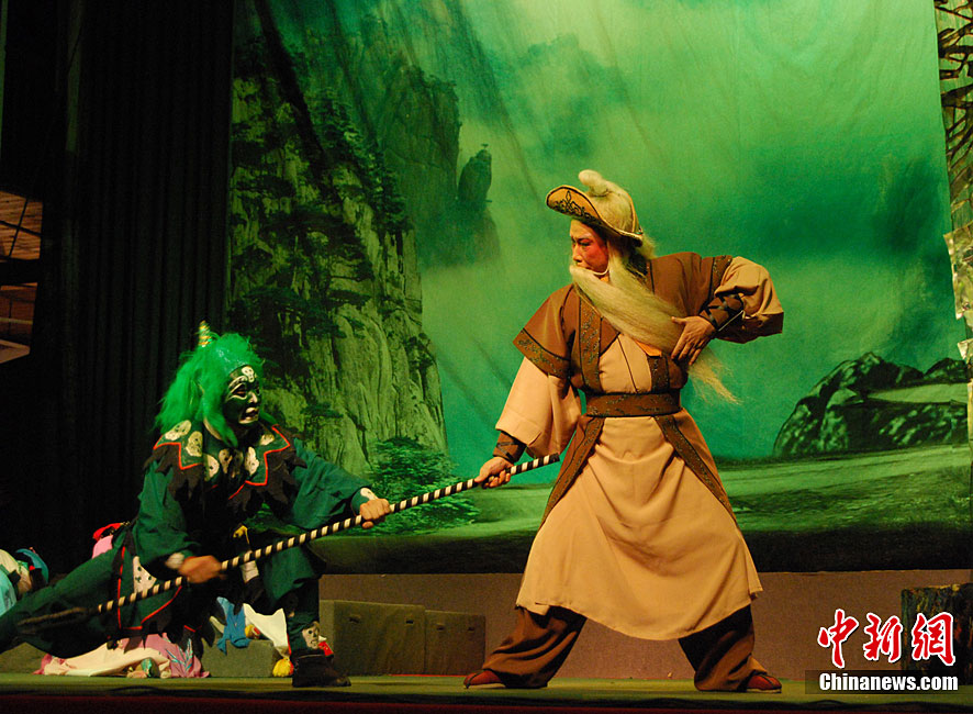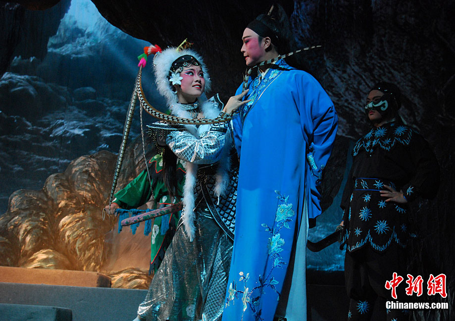 10月22日晚,中國首屆臨水夫人陳靖姑文化學(xué)術(shù)研討會獻演劇目,大型神話閩劇《臨水夫人陳靖姑》在陳靖姑祖廟所在地——福建古田精彩上演。該劇由古田縣閩劇團演出,共有《陳靖姑出世》、《蛇鬼禍害》、《延婚離家》、《結(jié)義學(xué)法》、《婚禮劍影》、《蛇鬼陰謀》、《哭別嬰兒》、《閩江祈雨》、《得道臨水》、《天上人間》10個場次,講述了陳靖姑降妖除魔、救助婦孺的感人事跡。兩岸媽祖宮廟代表人和當(dāng)?shù)匦疟,共同觀看了此次演出。李松 攝