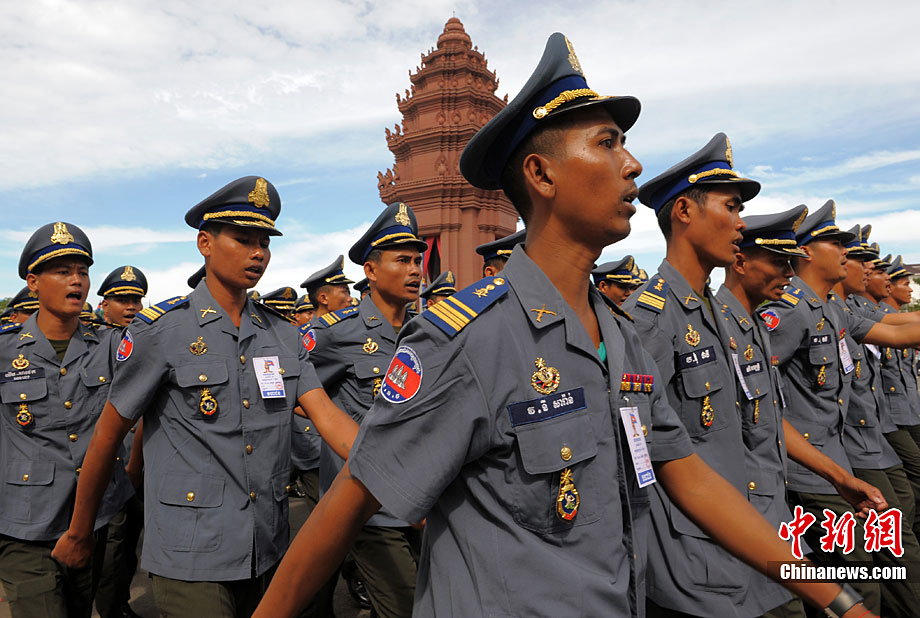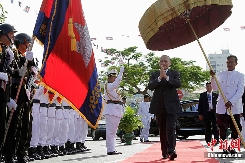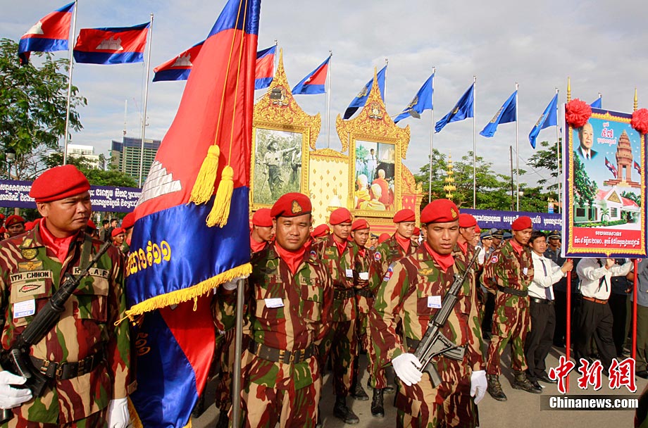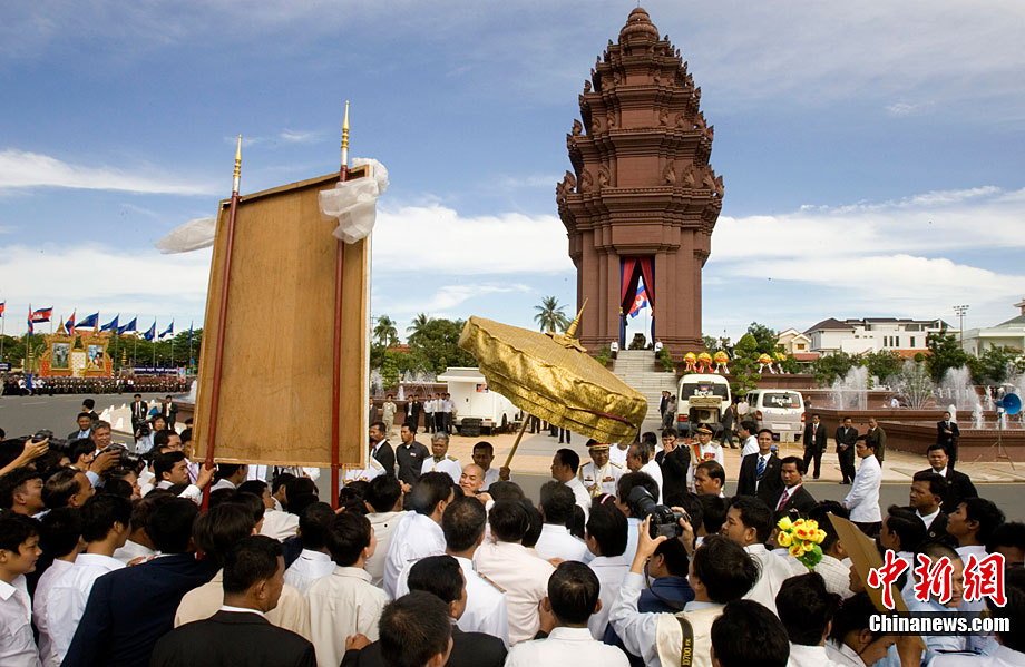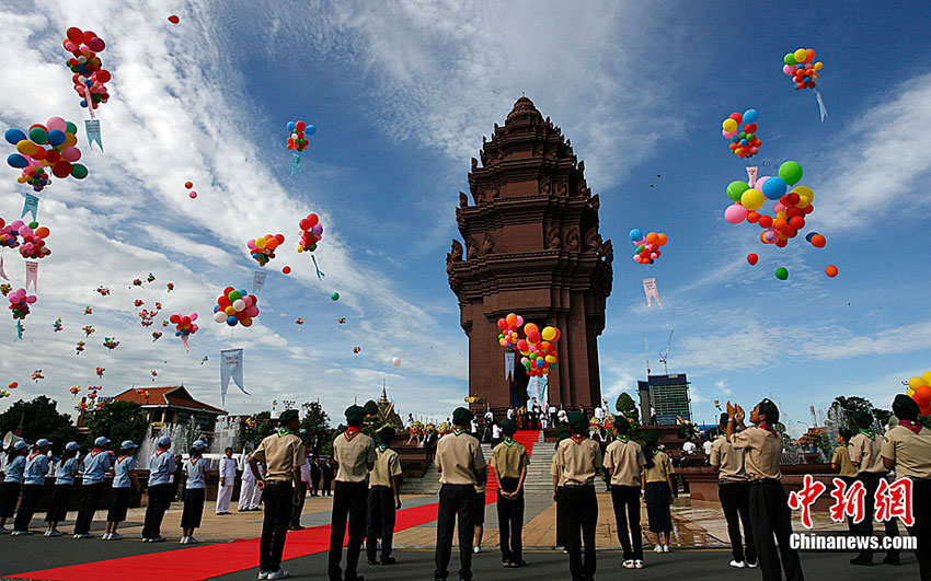 11月9日,工作人員在獨(dú)立節(jié)慶祝儀式上放飛彩球。當(dāng)天,柬埔寨在金邊獨(dú)立紀(jì)念碑廣場(chǎng)舉行盛大儀式,熱烈慶祝國(guó)家獨(dú)立57周年。柬埔寨國(guó)王西哈莫尼、國(guó)會(huì)主席韓桑林、政府首相洪森等政要以及各國(guó)駐柬使節(jié)和各界代表約2萬人出席儀式。