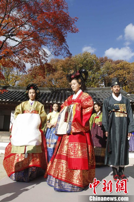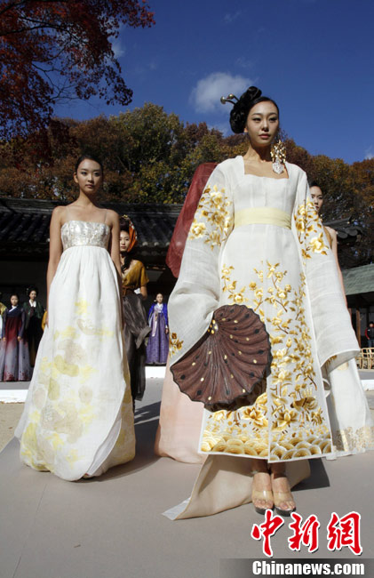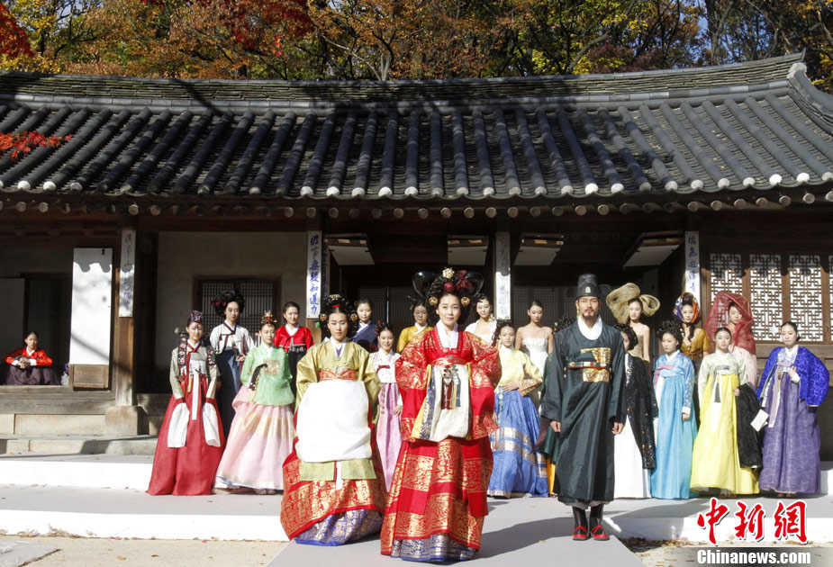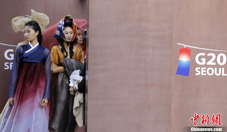 11月9日,韓國(guó)首爾昌德宮,模特進(jìn)行韓服服裝秀的排練。本次服裝秀是G20峰會(huì)期間的活動(dòng)之一。