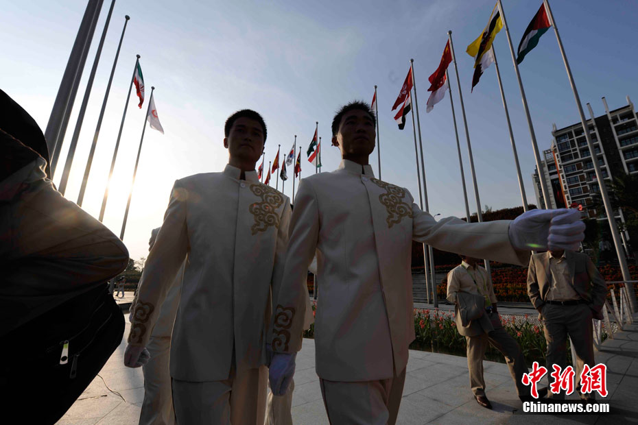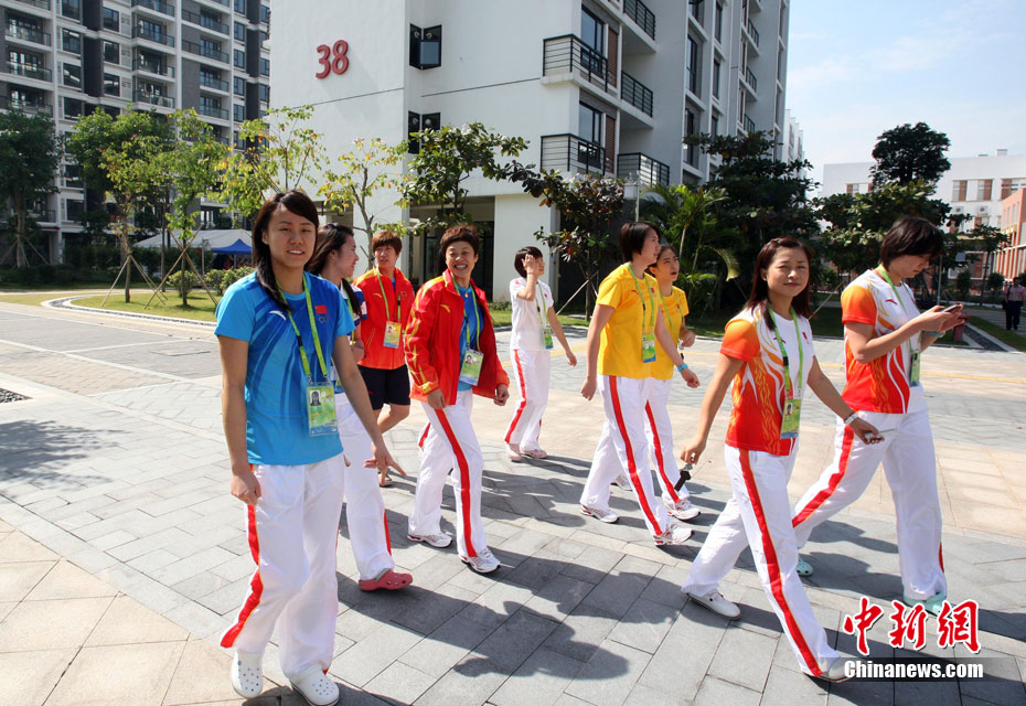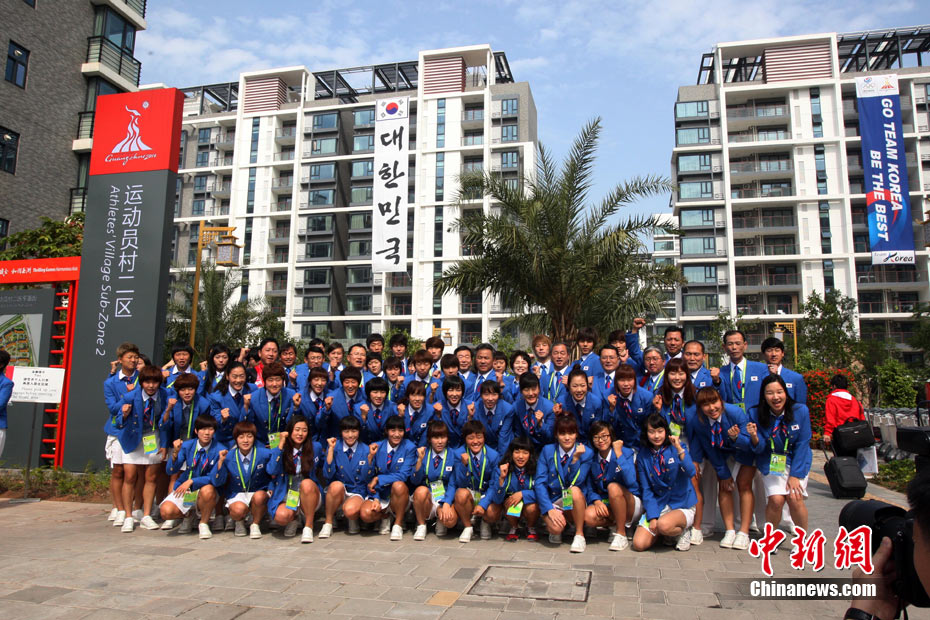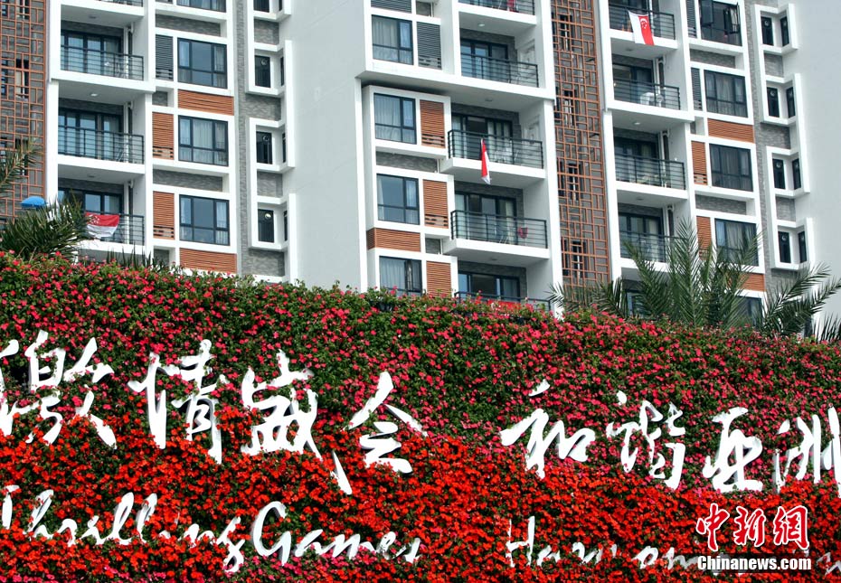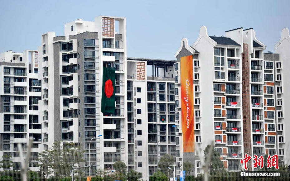 和歷屆亞運會不同,廣州亞運會沒有延續(xù)“亞運村”的概念,而是打造了一座亞運城,而運動員村則是亞運城的核心。運動員村位于亞運城內(nèi),總建筑面積59.1332萬平方米。運動員村共有49棟公寓樓、3598套公寓、9272間客房。應(yīng)該說,運動員村是一個高度專業(yè)化、集約化和規(guī)范化的居住區(qū)域,這里將為運動員及隨隊官員提供住宿分配、客房、洗衣、布草洗滌、居民服務(wù)中心等住宿服務(wù),全部是一條龍服務(wù)。圖為運動員公寓外景,不少運動員將自己國家的國旗懸掛在窗外。中新網(wǎng)記者 金碩 攝