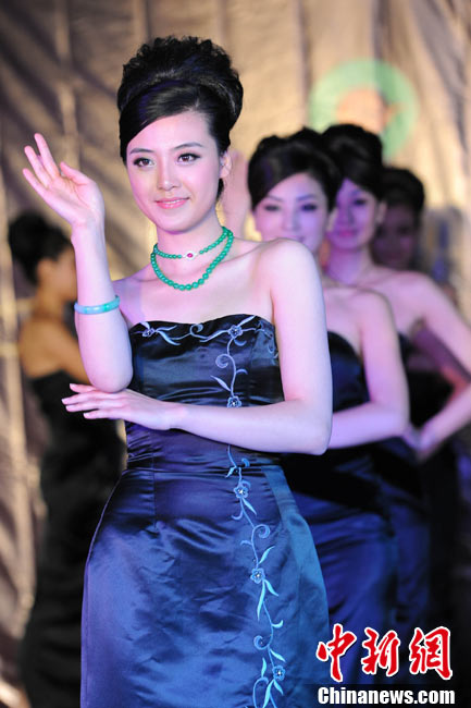 11月11日,2010中國國際珠寶展在北京中國國際展覽中心開幕,本屆展會(huì)規(guī)模42000平方米,近2000個(gè)展位,有來自22個(gè)國家和地區(qū)的961家企業(yè)參展,展覽面積比去年同期擴(kuò)大了40%。圖為2010中國國際珠寶展上模特展示珠寶首飾。中新社記者 錢興強(qiáng) 攝