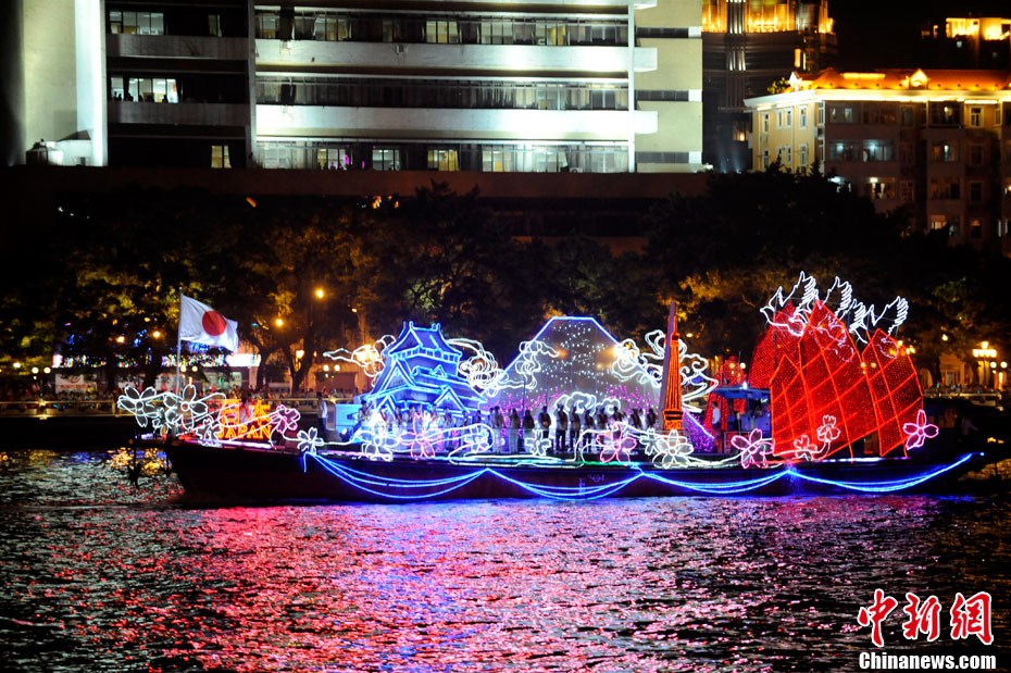 11月12日18時30分,廣州第十六屆亞運會開幕式啟動珠江巡游《一江歡歌》,45個代表團的燈光彩船暢游珠江。中新社記者 陳文 攝