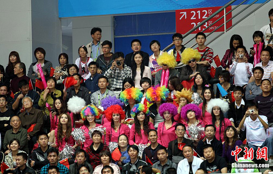 11月17日,廣州亞運(yùn)會(huì)男排小組賽迎來最后一天的較量。在當(dāng)晚進(jìn)行的中國男排對(duì)陣泰國男排的比賽中,看臺(tái)上一群美女觀眾令賽場(chǎng)氣氛大為火爆。中新社記者 鄧霞 攝