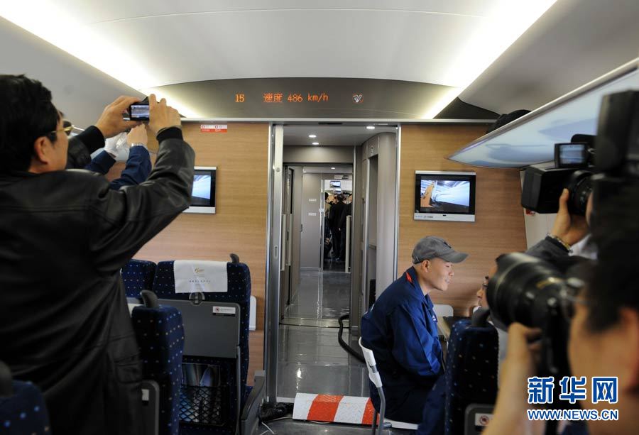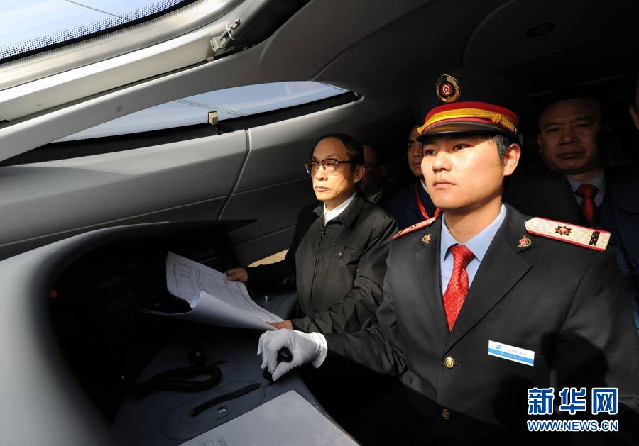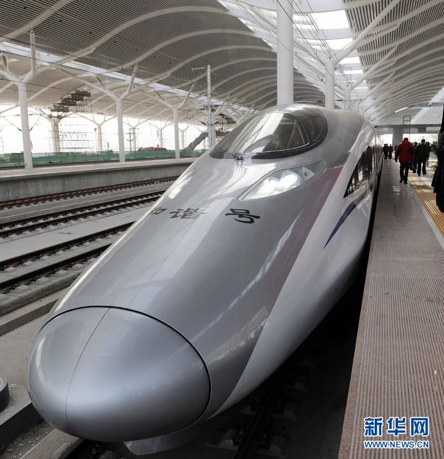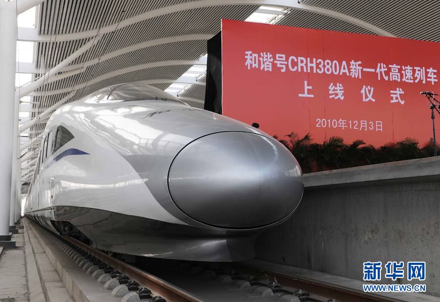 12月3日,將進行綜合試驗的“和諧號”CRH380A新一代高速動車組停在京滬高鐵徐州東站站臺。當(dāng)日上午11時左右,中國新一代高速動車組將在京滬高鐵先導(dǎo)段(棗莊至蚌埠)展開綜合試驗,預(yù)計最高時速將大大超過此前416.6公里的紀錄。 陳樹根 攝 圖片來源:新華網(wǎng)