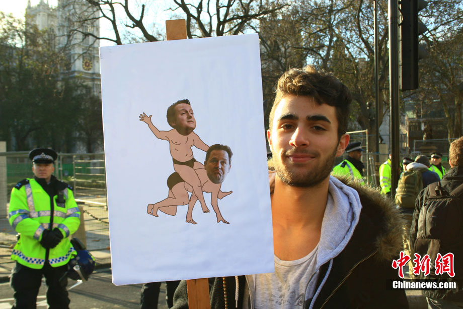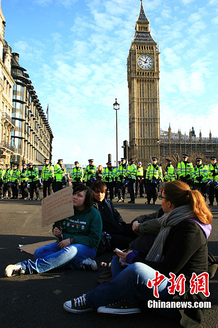 當(dāng)?shù)貢r間12月9日,為抗議議會表決通過政府有關(guān)大學(xué)學(xué)費上漲提案,倫敦爆發(fā)大規(guī)模學(xué)生抗議示威,引發(fā)示威者與警方?jīng)_突,37人受傷,15人被捕。圖為示威者沖破議會大廈前廣場施工柵欄。中新社記者 魏群 攝