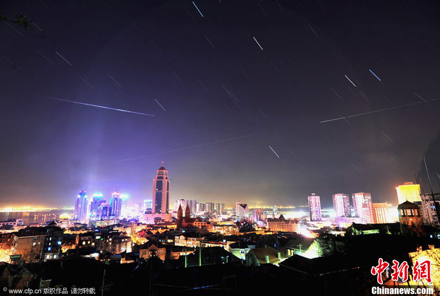 臨近歲末,雙子座流星雨如期而至。12月14日19時(shí),雙子座流星雨達(dá)到極大,每小時(shí)流星量達(dá)120顆。圖為山東青島棧橋景區(qū)上空明亮的流星從雙子星座輻射而出,劃過(guò)城市上空。周昆 攝 圖片來(lái)源:CFP視覺(jué)中國(guó)