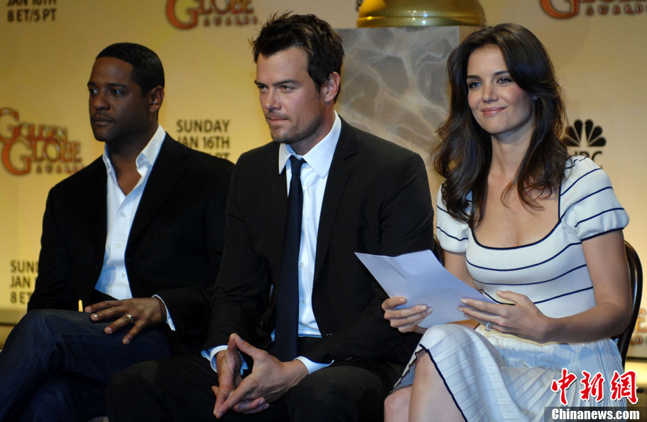 當(dāng)?shù)貢r(shí)間12月14日凌晨,第68屆美國金球獎(jiǎng)提名名單揭曉!秶醯难菡f》、《社群網(wǎng)戰(zhàn)》和《斗士》領(lǐng)跑電影類獎(jiǎng)項(xiàng)提名。圖為好萊塢明星、湯姆·克魯斯的妻子凱蒂·霍爾姆斯宣讀提名名單。中新社發(fā) 張煒 攝