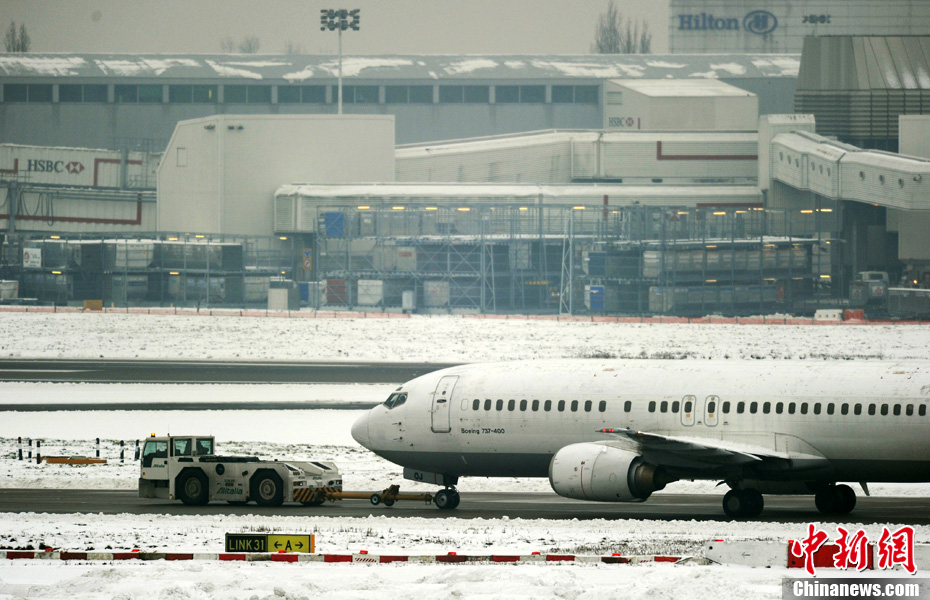 12月21日,在英國倫敦希思羅機(jī)場,一架飛機(jī)被拖車從停機(jī)坪上拖過。