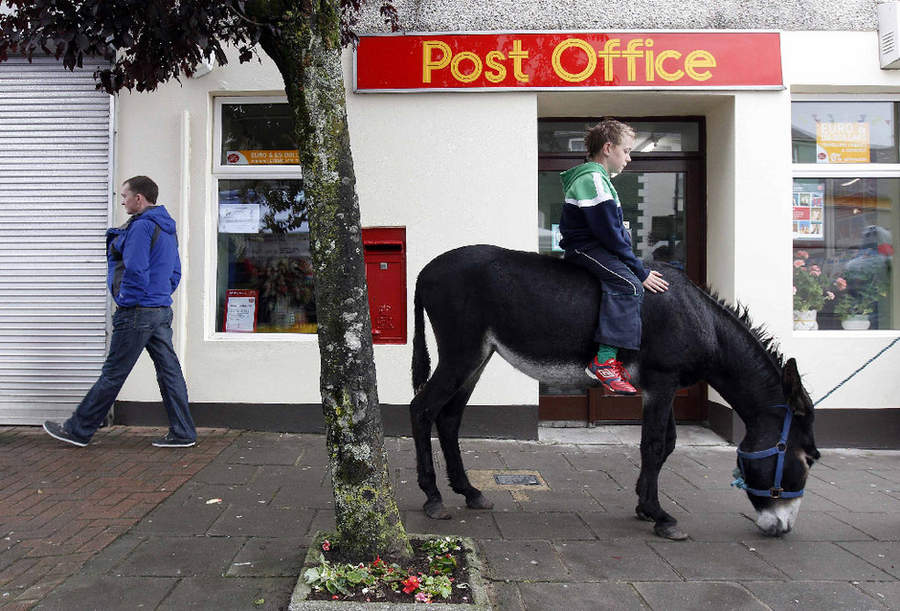 2010年3月23日,在愛(ài)爾蘭北部的德里布,一名女子正在向外倒垃圾。旁邊的壁畫上,一名英國(guó)士兵正使用大錘子擊倒一棟房子的大門。