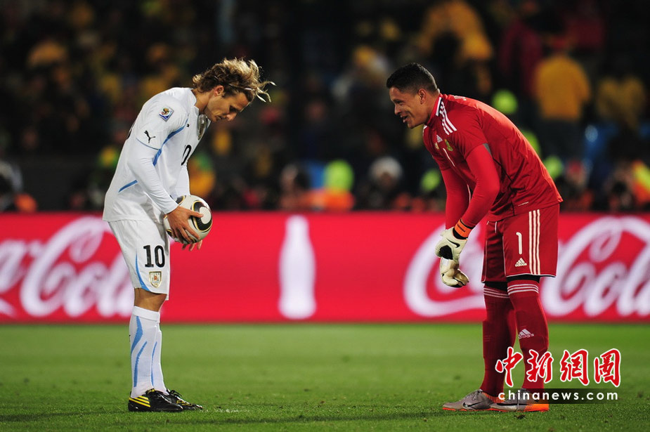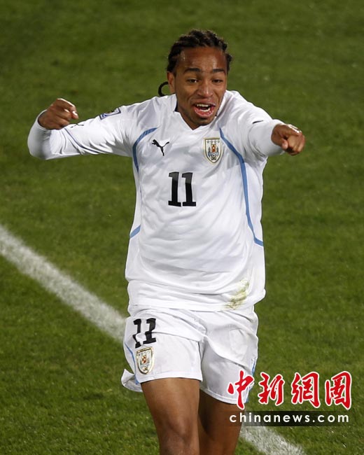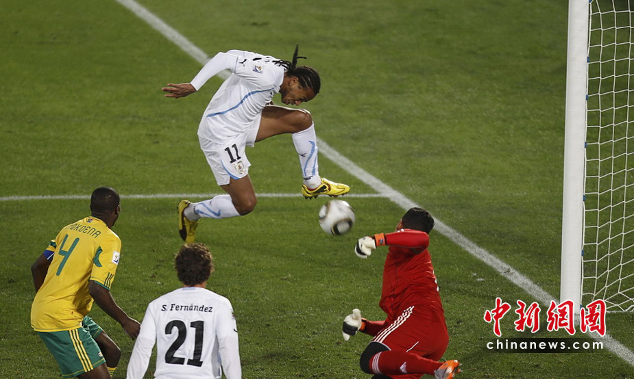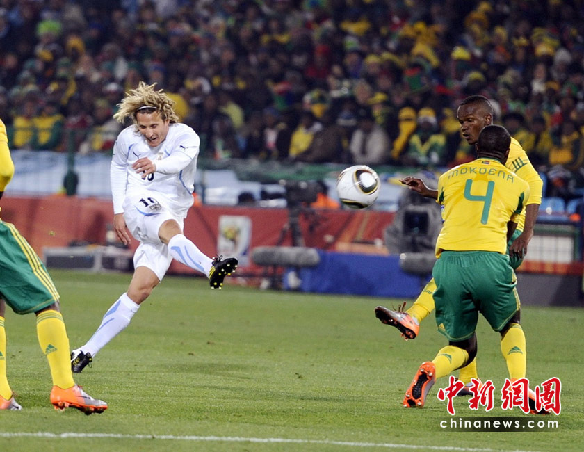 6月17日,世界杯A組第二輪南非迎戰(zhàn)烏拉圭。最終憑借弗蘭的梅開二度和佩雷拉終場(chǎng)補(bǔ)時(shí)的進(jìn)球,烏拉圭隊(duì)以3-0擊敗南非,出線形勢(shì)一片大好。