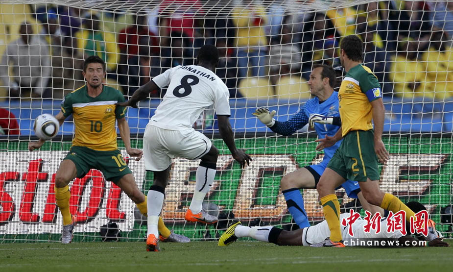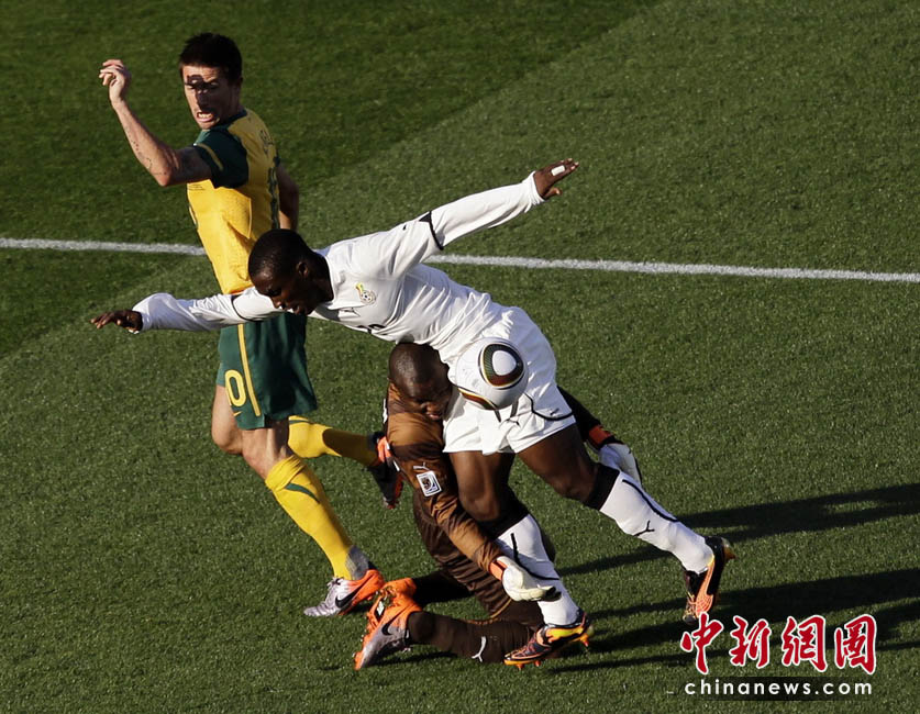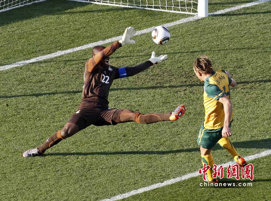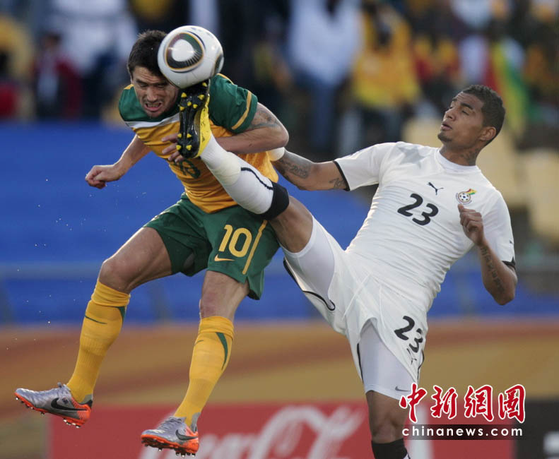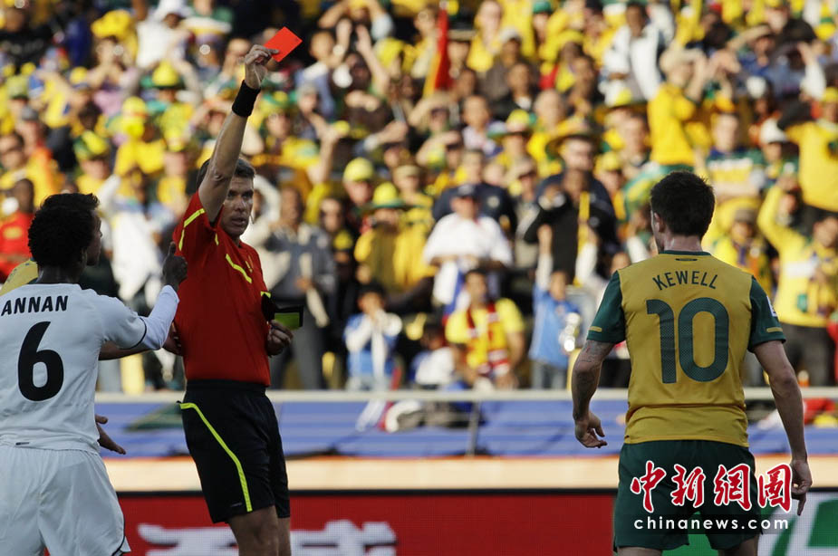6月19日,世界杯D組第2輪一場小組賽在勒斯騰堡的皇家班佛肯球場展開,加納隊(duì)迎戰(zhàn)澳大利亞隊(duì)。最終被罰下一人的澳大利亞隊(duì)1比1逼平加納。