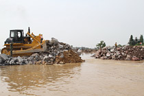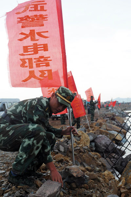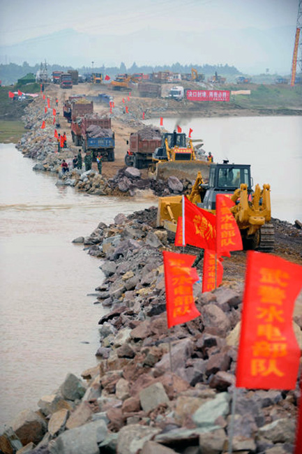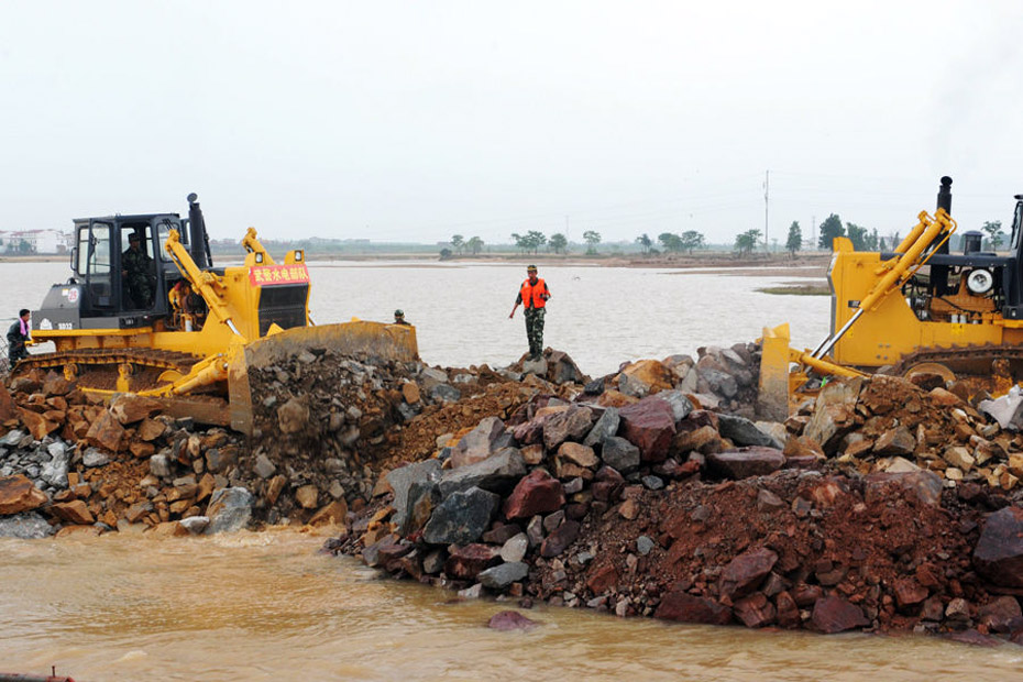 隨著最后一車土石投入河道,決口6天的江西撫州唱凱大堤終于合龍,恢復(fù)了它完整的堤身。原計劃6天完成的決口封堵任務(wù)提前3天完成。圖片來源:新華網(wǎng) 章武 攝
