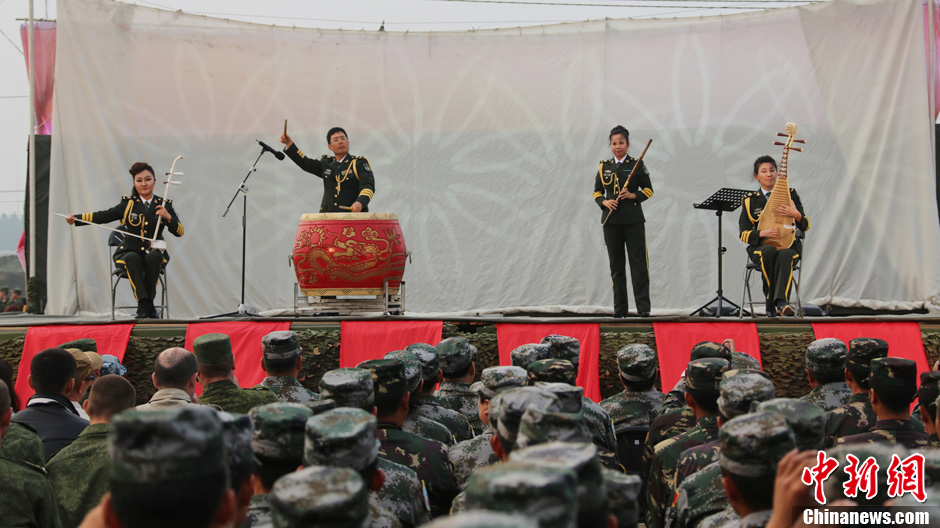 8月10日,隨同中方參演部隊赴俄羅斯參加“和平使命-2013”中俄聯(lián)演的沈陽軍區(qū)政治部文工團演員們,為中俄千余名參演官兵獻上了一場精彩的文藝晚會。豐富多彩的文藝節(jié)目,將位于切巴爾庫爾訓(xùn)練場的中俄聯(lián)演野營村,變成了友誼的盛會、歡樂的海洋。圖為民樂合奏《出征》。中新社發(fā) 李祥輝 攝