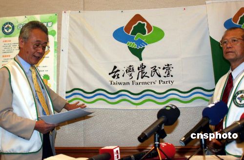 臺(tái)灣農(nóng)民黨十月二十五日正式公布該黨的黨徽、黨旗。農(nóng)民黨的黨徽狀似斗笠,象征農(nóng)民;斗笠頂部為土色,象征土地;籃、綠兩只手握在一起,表達(dá)該黨的理念:希望各政黨團(tuán)結(jié)合作,不要惡斗。農(nóng)民黨的黨旗,是在黨徽之下有三條水紋,象征大海。土地、海洋、斗笠,象征農(nóng)民黨。中新社發(fā) 耿軍 攝