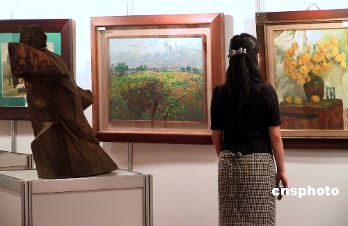 十一月十二日,現(xiàn)代中國(guó)藝術(shù)家張大千、吳冠中、范曾以及臺(tái)灣雕塑大師朱銘等人作品在臺(tái)北展出,這些作品將出現(xiàn)在本月下旬香港一家藝術(shù)品拍賣公司邦瀚斯舉辦的秋季拍賣會(huì)上。圖為臺(tái)北市民觀摩藝術(shù)品。中新社發(fā) 劉舒凌 攝