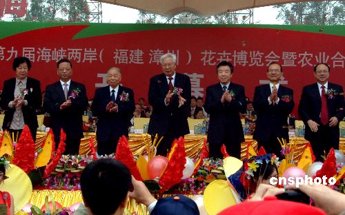 十一月十八日上午,第九屆海峽兩岸(福建漳州)花卉博覽會暨農(nóng)業(yè)合作洽談會在福建漳州花博園開幕。圖為全國政協(xié)副主席羅豪才(中)、張克輝(左三),中共福建省委書記盧展工(右三)、省長黃小晶(左二),中國國民黨副主席林豐正(右二)等兩岸嘉賓出席開幕式。中新社發(fā) 王東明 攝