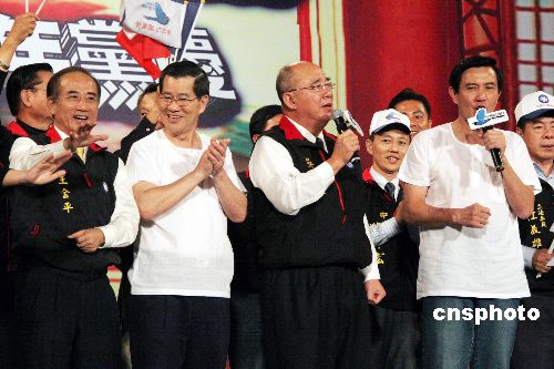 11月24日,中國國民黨在臺灣中部的嘉義市舉行萬人造勢活動,紀(jì)念該黨成立一百一十三周年,也為明年臺灣的兩次重要選舉拉抬聲勢。圖為馬英九、蕭萬長、吳伯雄、王金平等全體與會者高唱《我們都是一家人》、《愛拚才會贏》等歌。整個造勢活動突出“拚經(jīng)濟、顧生活”的訴求和“以臺灣為主,對人民有利”的主題。中新社發(fā) 黃少華 攝