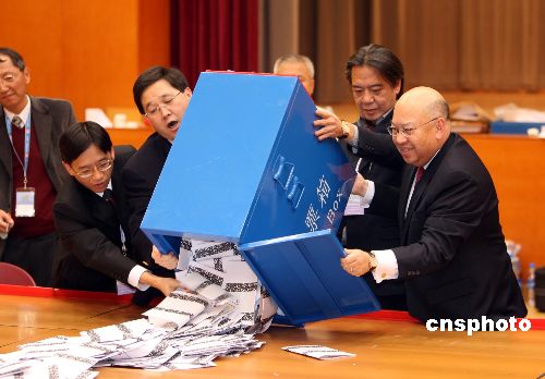 12月2日深夜,香港選管會主席彭鍵基[右]及政制及內地事務局局長林瑞麟[左二]到達票站,開啟票箱,票站內點票工作隨即展開。當日,香港立法會港島區(qū)補選共有八名候選人競逐一個議席,分別是:柳玉成、李永健、蕭思江、葉劉淑儀、蔣志偉、凌尉云、陳方安生、以及何來。中新社發(fā) 洪少葵 攝
