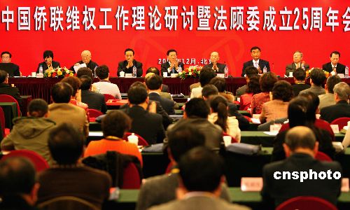 12月8日至9日,中國僑聯(lián)維權(quán)工作理論研討暨紀(jì)念法顧委成立25周年會議在北京召開,會議表彰了近五年來各地僑聯(lián)維權(quán)工作先進(jìn)單位和個(gè)人。會議就建立維權(quán)長效機(jī)制,切實(shí)維護(hù)歸僑僑眷和海外僑胞在國內(nèi)的合法權(quán)利和利益進(jìn)行理論研討。中國僑聯(lián)法顧委是1982年5月6日成立的中國僑聯(lián)高層法律服務(wù)顧問機(jī)構(gòu)。中新社發(fā) 張勤 攝