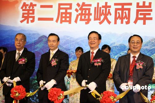 十二月十四日,“第二屆海峽兩岸臺北旅展”在臺北世貿(mào)展館開幕。臺灣觀光協(xié)會會長張學(xué)勞(左三),來自大陸方面的海峽兩岸旅游交流協(xié)會副秘書長范貴山(左二)等人為開幕式剪彩。中新社發(fā) 董會峰 攝