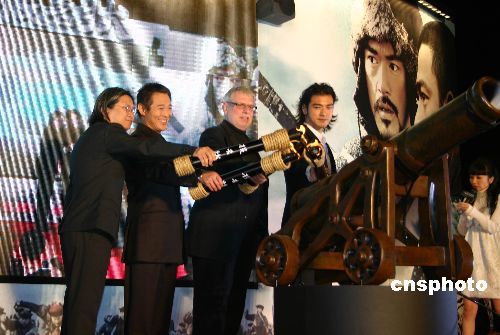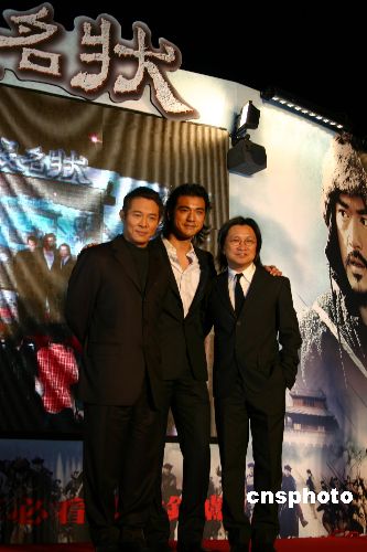 年底最矚目的華語(yǔ)大片《投名狀》十八日晚在臺(tái)北舉行了首映禮。導(dǎo)演陳可辛帶領(lǐng)片中明星李連杰、金城武等人參加首映會(huì),并點(diǎn)燃禮花慶祝。中新社發(fā) 陳國(guó)華 攝