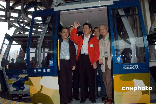 12月22日,香港商務及經(jīng)濟發(fā)展局局長馬時亨(中)早上試坐昂坪360纜車,馬贊賞纜車有改善,又說坐得很放心,呼吁市民及游客都應該來坐纜車。中新社發(fā) 譚達明 攝