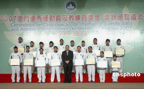 一月四日晚,澳門社會(huì)文化司崔世安司長(zhǎng)在漁人碼頭向2007年澳門優(yōu)秀運(yùn)動(dòng)員及教練員頒發(fā)獎(jiǎng)金和獎(jiǎng)狀,以表?yè)P(yáng)他們?cè)谫愂轮蝎@得的優(yōu)異成績(jī)。圖為崔世安司長(zhǎng)與部分優(yōu)秀運(yùn)動(dòng)員教練員合影。中新社發(fā) 史利 攝