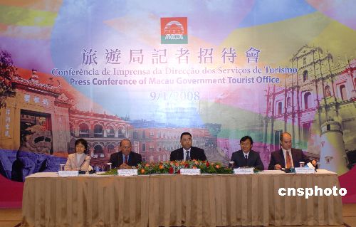 一月九日,崔世安(中)出席澳門旅游局在漁人碼頭舉行的記者招待會(huì)并答記者問。當(dāng)日,澳門旅游局公布﹐2007年澳門入境旅客超過2700萬(wàn)人次,增幅為22.7%。中國(guó)內(nèi)地仍是最大市場(chǎng),約占整體旅客的55%,其中48%為“個(gè)人游”旅客,其次是香港、臺(tái)灣旅客。中新社發(fā) 史利 攝