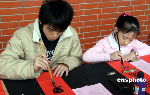 圖為兩位青少年書法愛好者正在寫春聯(lián)。