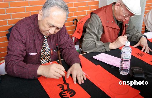 圖為兩位功底深厚的書畫大家正在為民眾書寫春聯(lián)。