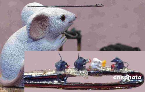 1月27日,臺(tái)灣微雕大師陳逢顯展示自己以樹脂為原材料雕塑的當(dāng)今世界最小的老鼠,以迎接鼠年新春。通過高倍放大鏡可欣賞到白鼠頭頂繡花針上的微雕作品——栩栩如生的一白三灰四只小鼠(右下),平均每只僅0.27毫米大小。中新社發(fā) 孫自法 攝
