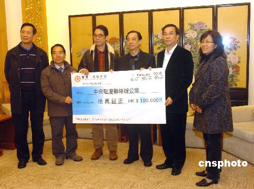 二月一日,香港工會(huì)聯(lián)合會(huì)(工聯(lián)會(huì))理事長(zhǎng)黃國(guó)建(左三)、副會(huì)長(zhǎng)梁富華(左二)前往中央人民政府駐香港特別行政區(qū)聯(lián)絡(luò)辦公室(中聯(lián)辦),遞交港幣十萬元支票,救濟(jì)內(nèi)地雪災(zāi)受災(zāi)省區(qū)。中新社發(fā) 鄧慶樂 攝