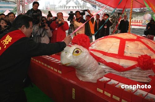 二月十五日,二00八臺(tái)北花燈節(jié)開(kāi)幕,澎湖縣天后宮媽祖受邀前來(lái)。按照當(dāng)?shù)刈诮虃鹘y(tǒng),澎湖人員在花燈節(jié)現(xiàn)場(chǎng)造乞龜臺(tái)一座,舉行點(diǎn)青官為“元宵乞龜”點(diǎn)青儀式。中新社發(fā) 徐長(zhǎng)安 攝