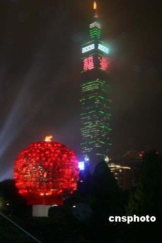 2月中旬,2008臺北花燈節(jié)在臺北市熱鬧舉行,今年主題為“囍迎曙光耀繁城”。主燈(圖中紅色圓燈)為金鼠娶親,由一百只造型卡通的老鼠組成,主燈與遠(yuǎn)處臺北一0一大樓交相輝映。中新社發(fā) 徐長安 攝