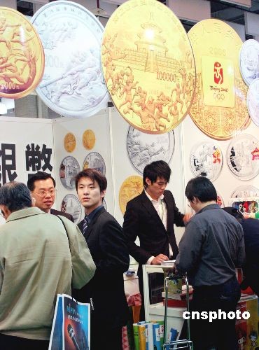 3月7日,為期5天的第21屆亞洲國際郵展在臺北開幕,展出競賽類、非競賽類及榮譽(yù)類的展品超過1000框。其中上海版飛雁加印小字郵票,紅印花加字郵票和大龍?jiān)囉∑钡葍r(jià)值新臺幣上千萬元以上的珍稀郵票,最引人注目。圖為一家臺灣公司設(shè)攤展出北京奧運(yùn)紀(jì)念金銀幣,并在現(xiàn)場向民眾贈送北京奧運(yùn)吉祥物福娃宣傳海報(bào)。中新社發(fā) 黃少華 攝