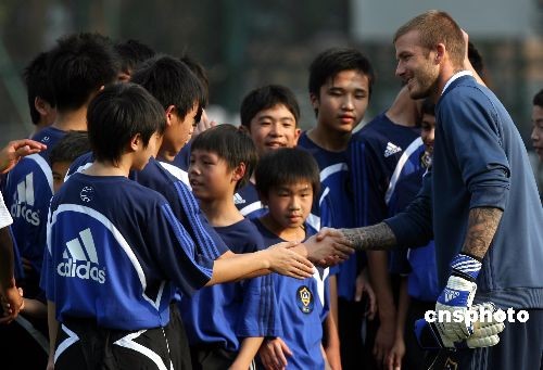 三月七日,英國足球巨星貝克漢姆與洛杉磯銀河隊的隊友在香港指導(dǎo)本地足球小將,推廣足球運動。中新社發(fā) 武仲林 攝