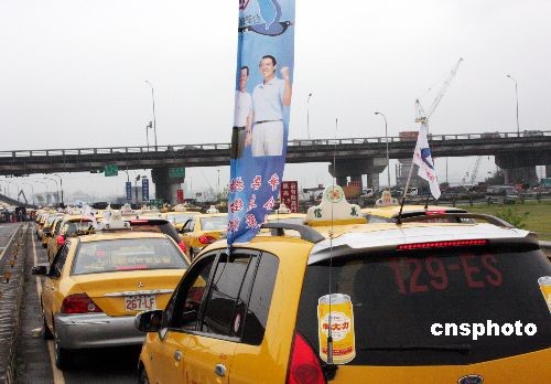 3月10日,一向給外界挺綠印象的臺(tái)北全民計(jì)程車聯(lián)誼會(huì)決定在此次臺(tái)灣大選中棄綠轉(zhuǎn)藍(lán),在總會(huì)長邱奕枝號(hào)召下,陸續(xù)聚集2500輛計(jì)程車并成立馬蕭后援會(huì),場(chǎng)面壯觀。圖為在集會(huì)現(xiàn)場(chǎng),許多計(jì)程車插上馬蕭競(jìng)選旗幟,司機(jī)戴上有關(guān)標(biāo)識(shí)帽子。中新社發(fā) 黃少華 攝