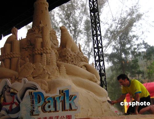 香港海洋公園將于三月二十一日至四月二十日推出“高清動(dòng)物月”,并將舉辦香港首個(gè)大型沙雕展覽,吉尼斯最高及最長(zhǎng)沙雕藝術(shù)品的紀(jì)錄保持者Ted Siebert及其隊(duì)友將以二百?lài)嵣尺M(jìn)行創(chuàng)作。圖為十八日,一位藝術(shù)家正在進(jìn)行沙雕創(chuàng)作。中新社發(fā) 陳伊敏 攝